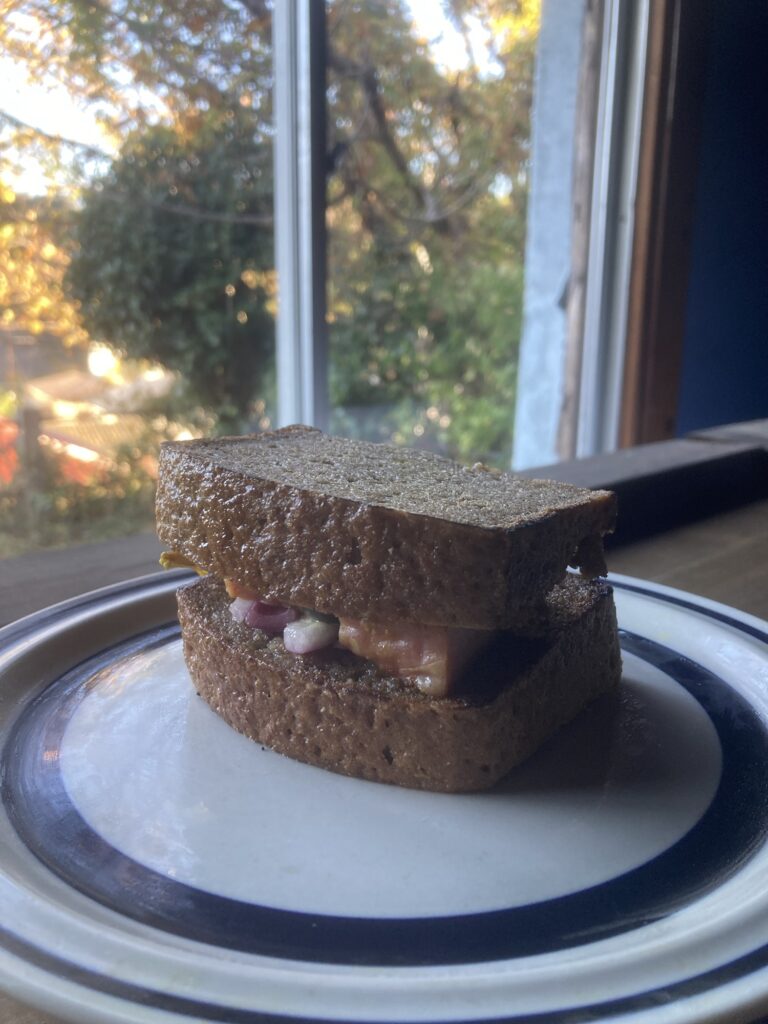 発酵させた玄米と甘酒、麹のクリームを塗り、赤玉ねぎのライムピクルスに、マスタードとベーコンをはさんだ。